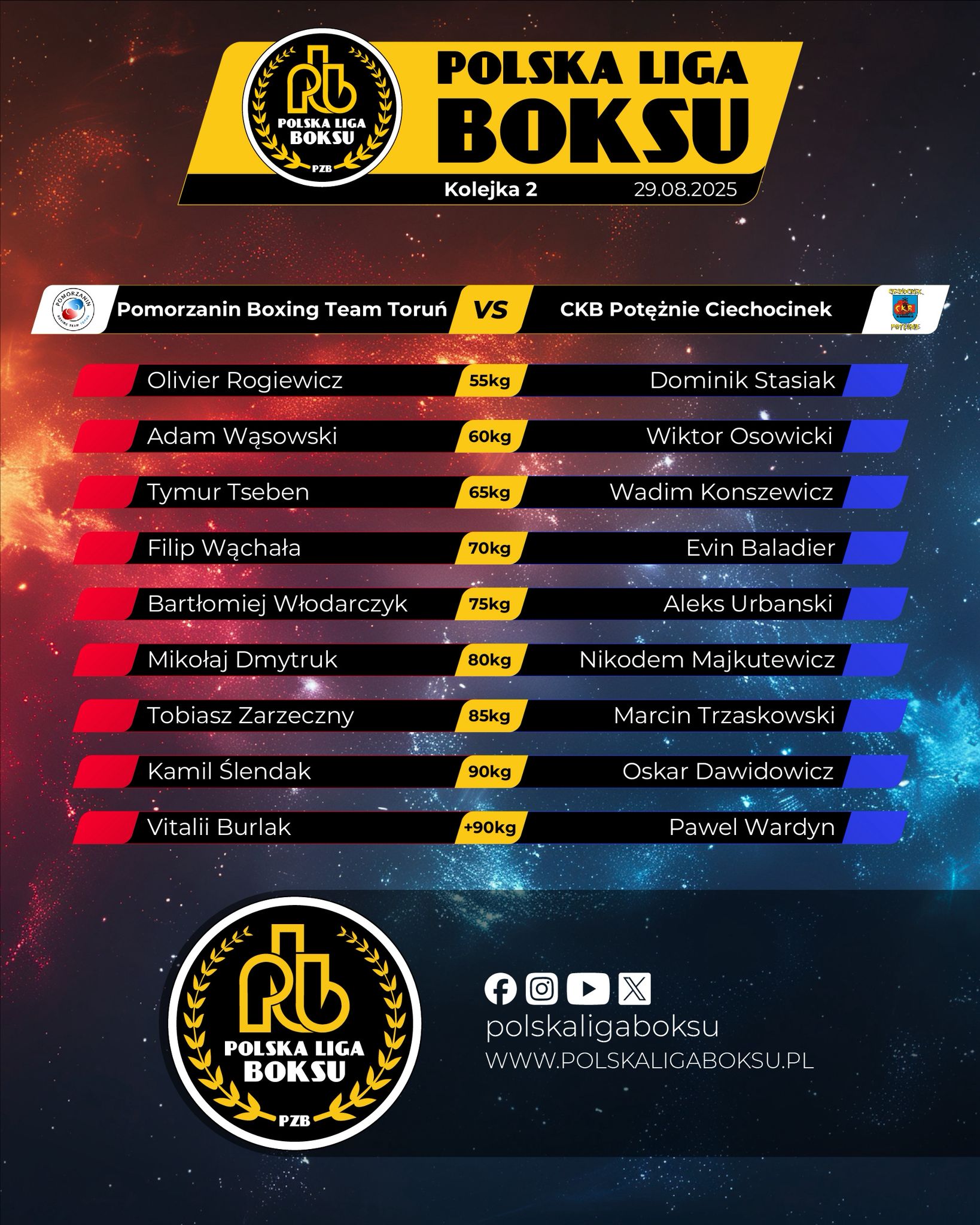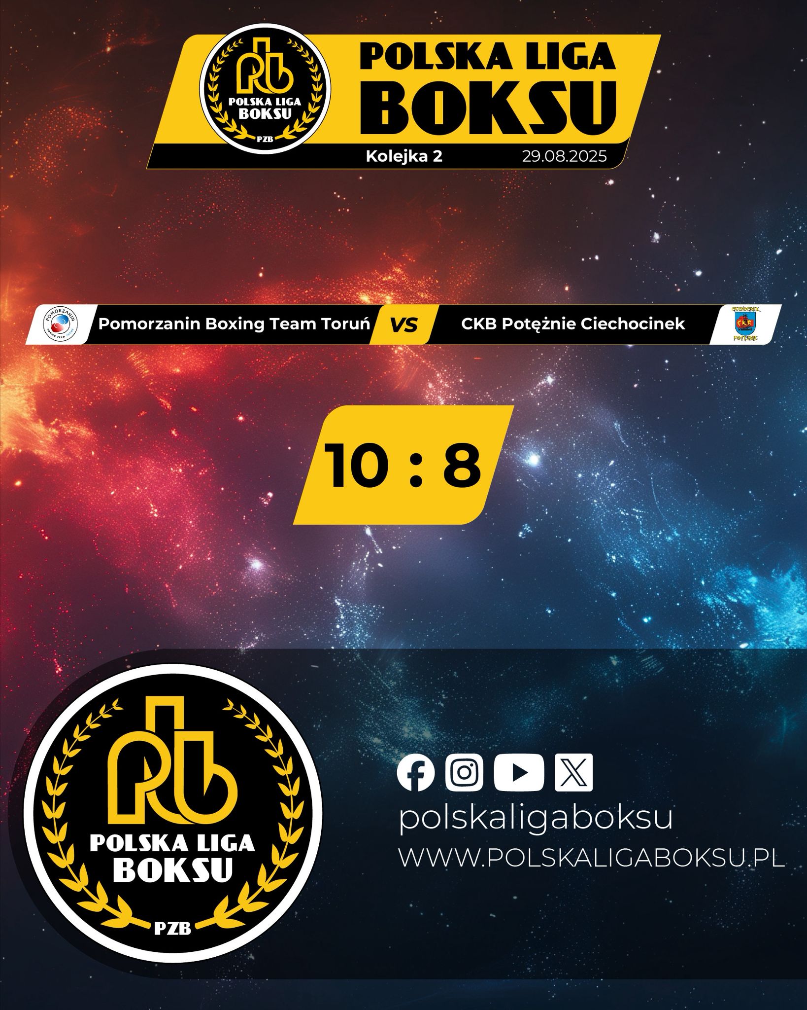 2025-09-01W rozegranym w Chełmży (powiat toruński) meczu kończącym pierwszą rundę Polskiej Ligi Boksu, gospodarz Pomorzanin Boxing Team Toruń pokonał CKB Potężnie Ciechocinek 10:8. Triumfatorzy odnieśli piąte zwycięstwo w sezonie i zrównali się punktami (po 10) z wiceliderem Wojskowym Klubem Bokserskim Rushh Kielce. Na prowadzeniu KB Legia Warszawa – 14 pkt.