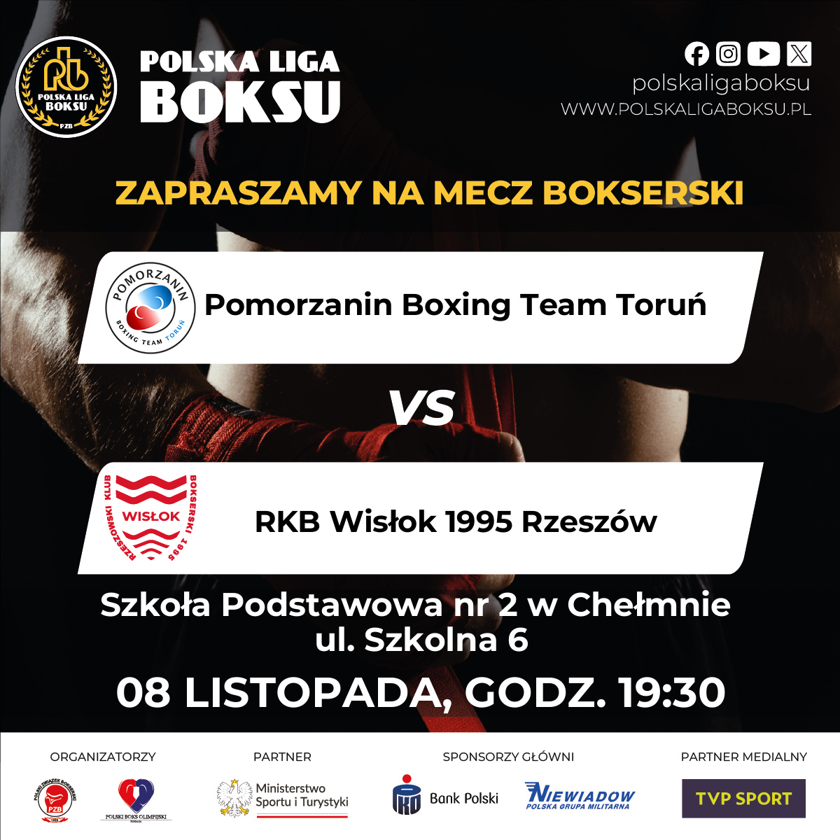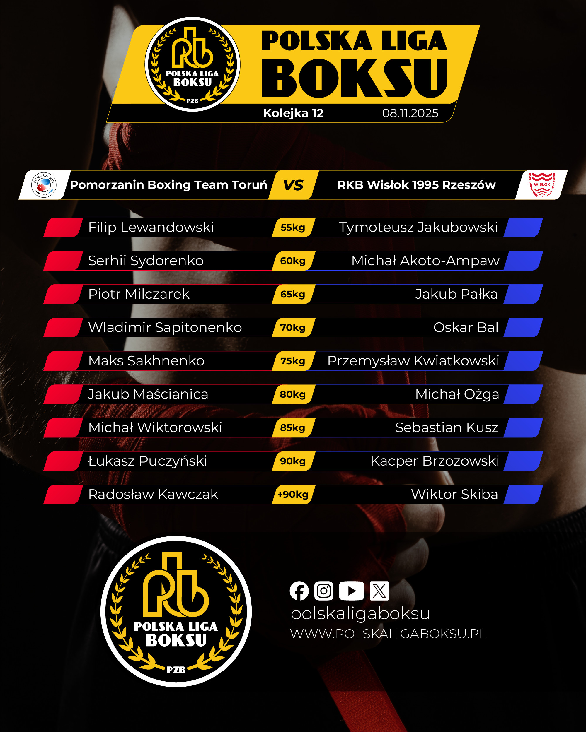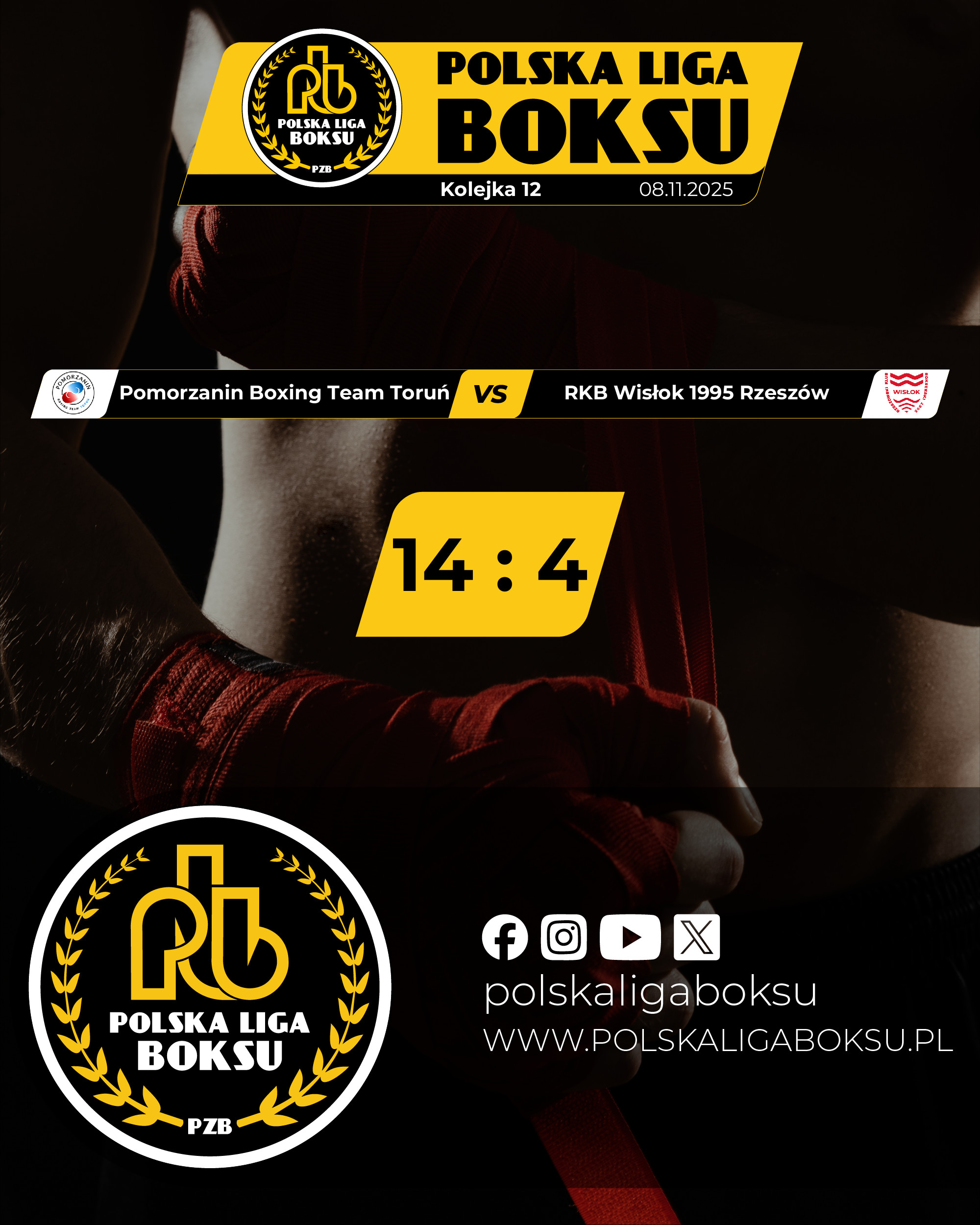 2025-11-09Pomorzanin Boxing Team Toruń pokonał RKB Wisłok 1995 Rzeszów 14:4 w sobotnim meczu 12 kolejki Polskiej Ligi Boksu. Dla torunian to siódme zwycięstwo w sezonie – zgromadzili 14 punktów i zrównali się z Imperium Boxing Wałbrzych (3 miejsce).