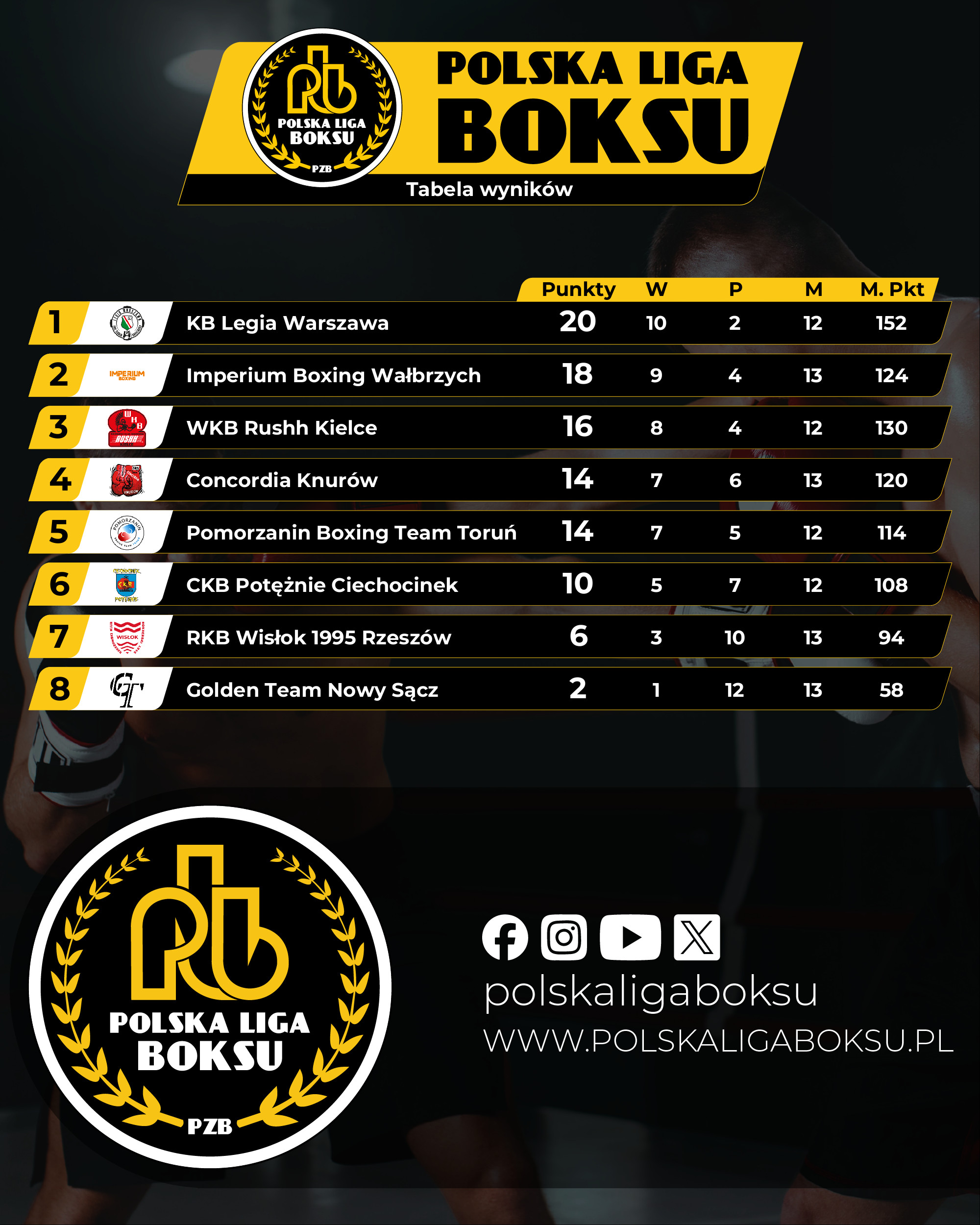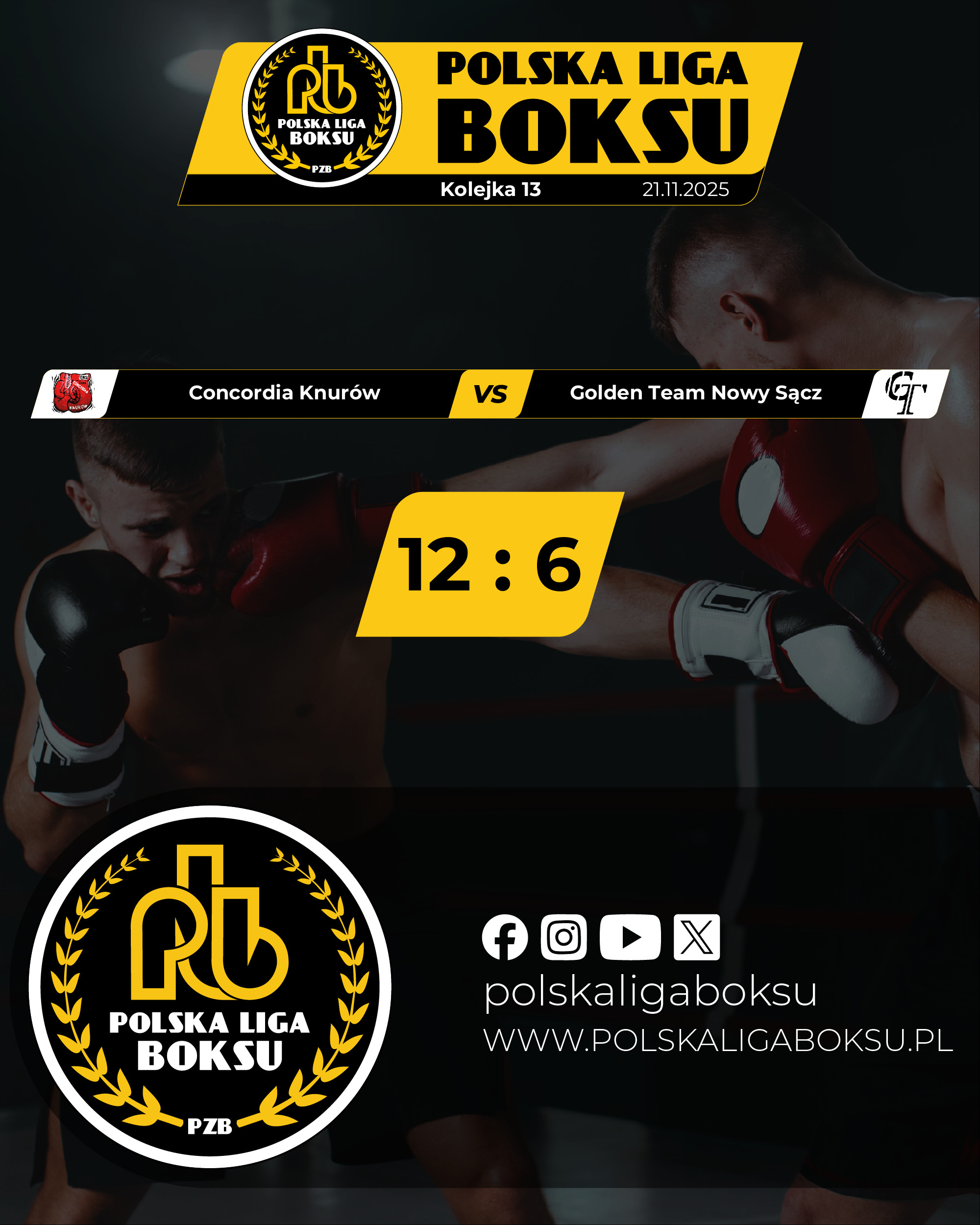 2025-11-22Druga część sezonu Polskiej Ligi Boksu należy bezsprzecznie dla Concordii Knurów. W piątkowy wieczór podopieczni trenera Ireneusza Przywary pokonali Golden Team Nowy Sącz 12:6. To było ich szóste (komplet) zwycięstwo w rundzie rewanżowej.