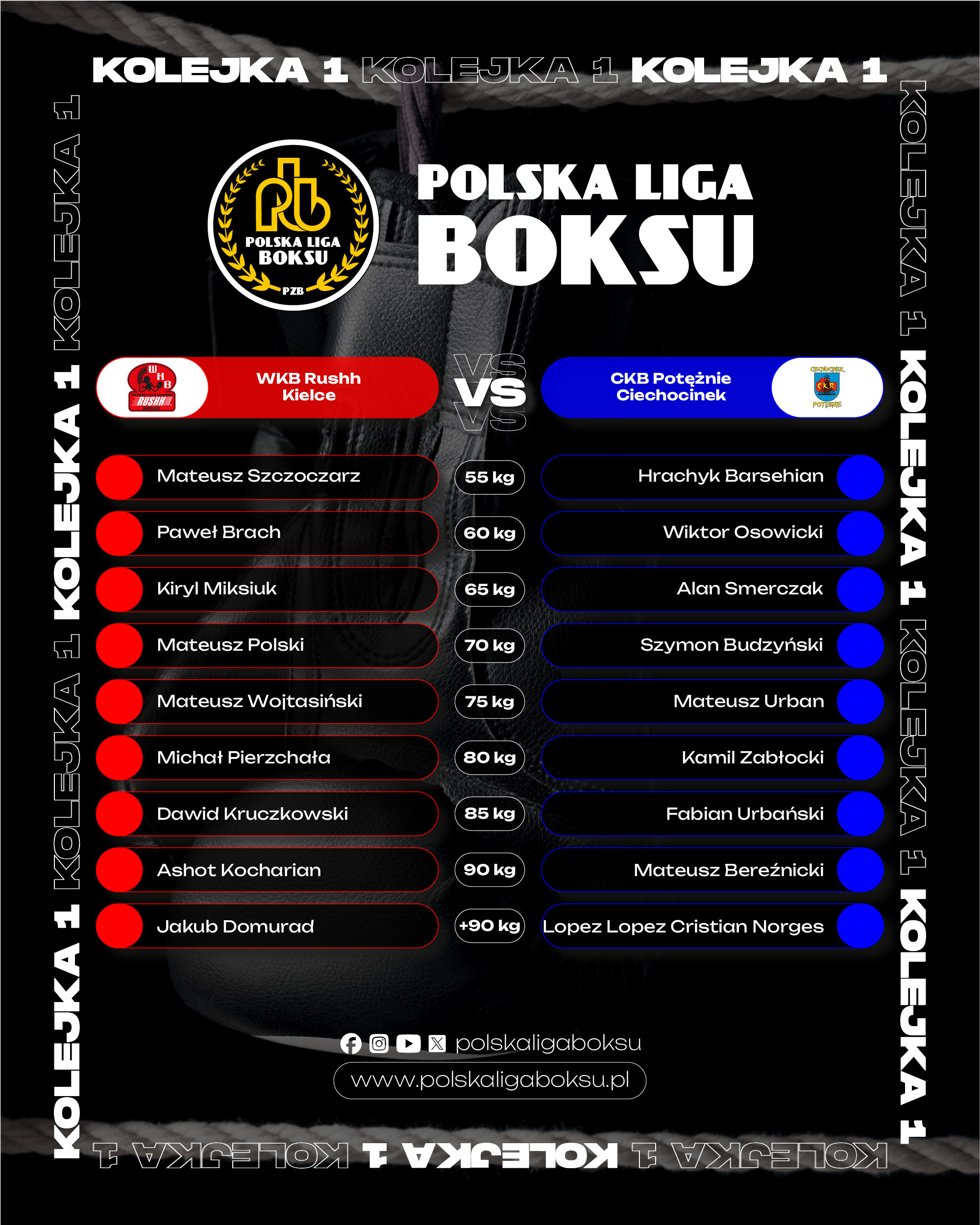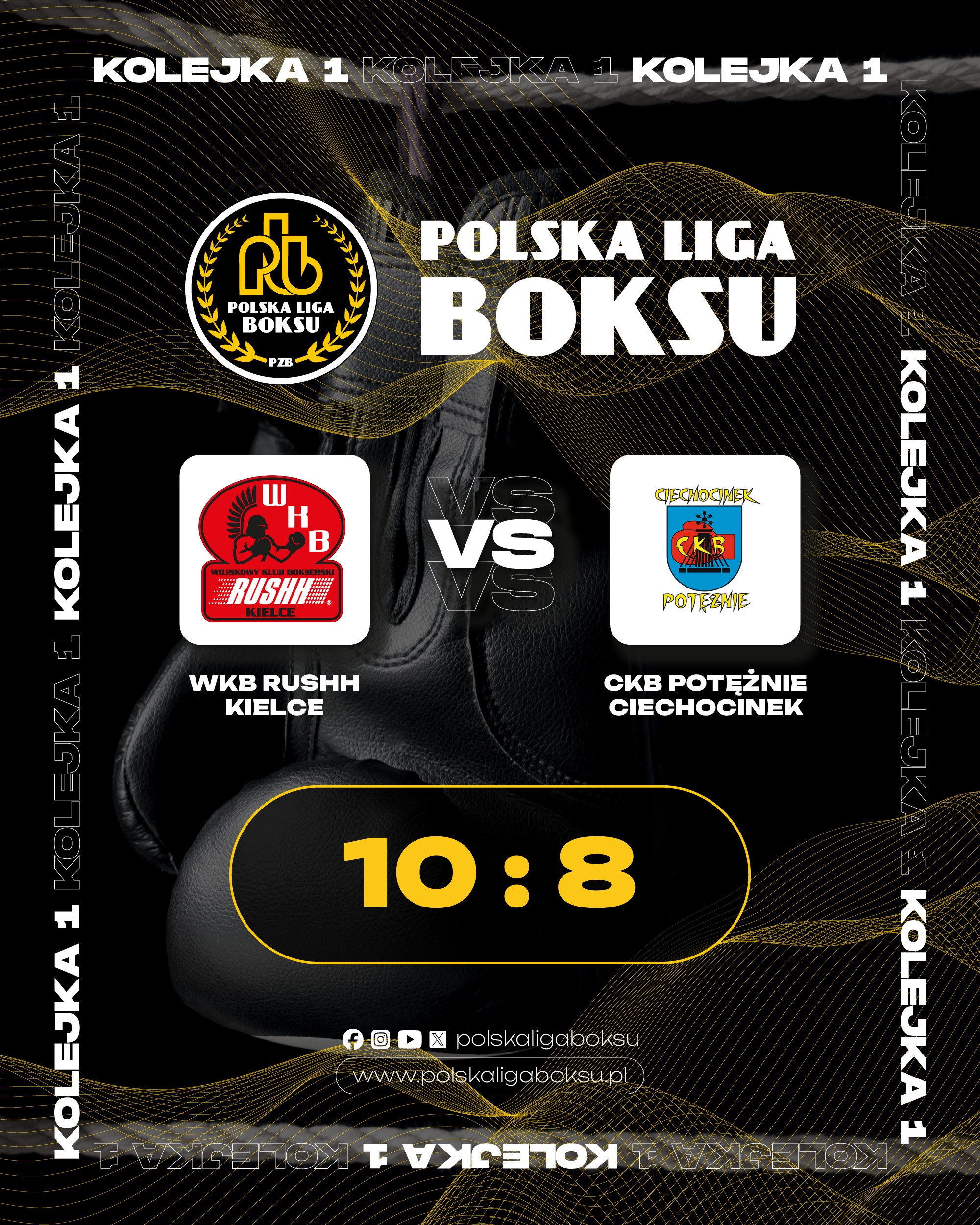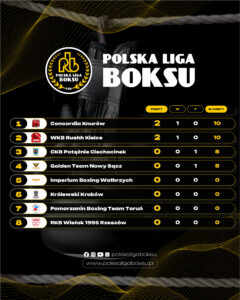 2026-03-20Wicemistrz Polski Wojskowy Klub Bokserski Rushh Kielce wygrał z Ciechocińskim Klubem Bokserskim Potężnie Ciechocinek 10:8 w meczu 1 kolejki Polskiej Ligi Boksu. Na trybunach hali przy ulicy Żytniej był legendarny polski pięściarz Andrzej Gołota.