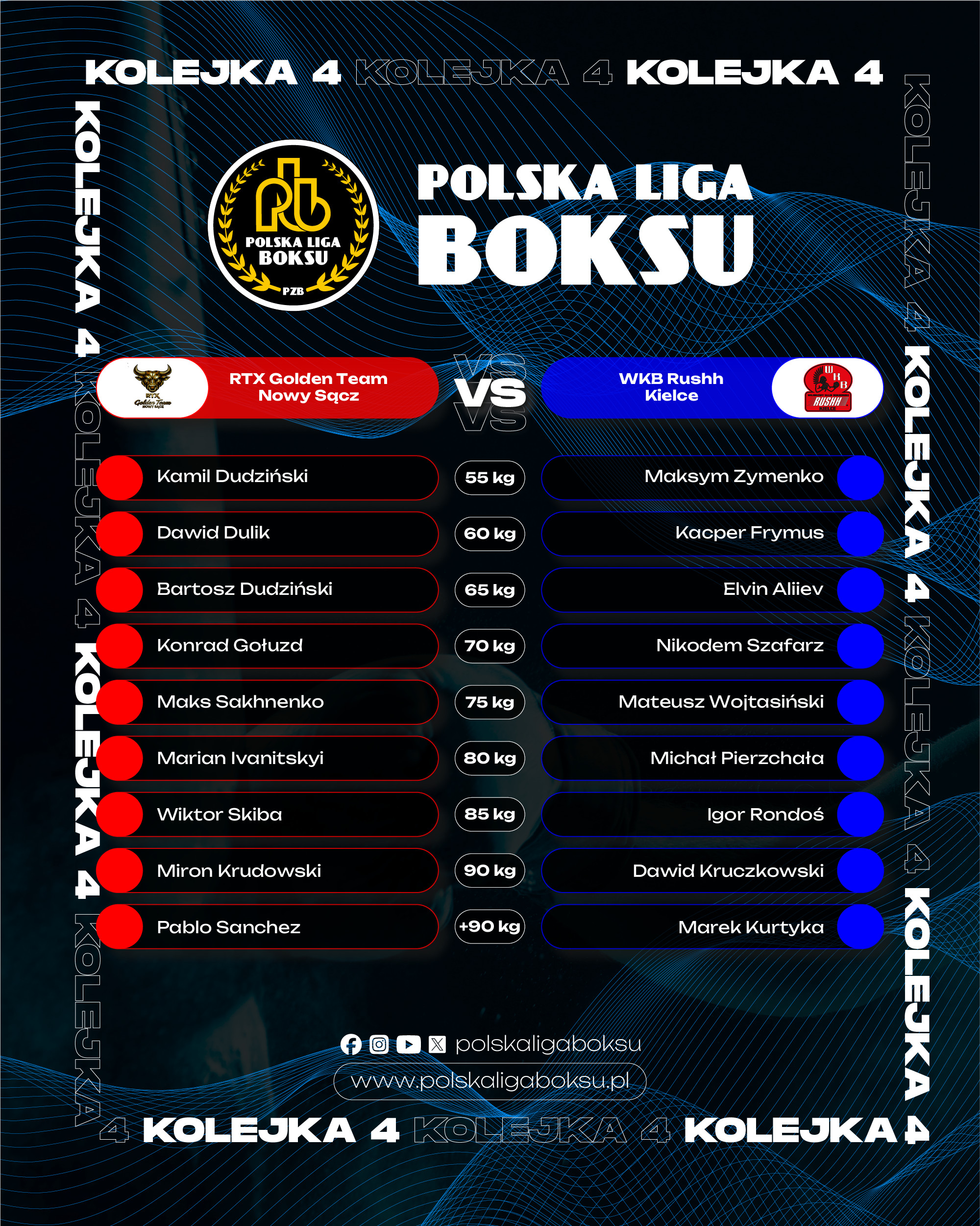 Na zakończenie 4 kolejki Polskiej Ligi Boksu dojdzie do meczu Imperium Boxing Wałbrzych – CKB Potężnie Ciechocinek – wtorek (28 kwietnia), g. 17:00. Transmisja w TVP Sport.