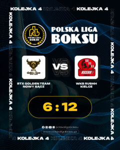Wojskowy Klub Bokserski Rushh Kielce odniósł czwarte z rzędu zwycięstwo w nowym sezonie Polskiej Ligi Boksu i samodzielnie prowadzi w tabeli. Podopieczni trenerów Daniela Adamca i Konrada Rondosia w poniedziałkowy wieczór pokonali na wyjeździe RTX Golden Team Nowy Sącz 12:6.